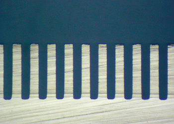 シリコンウエハーに幅25μm、ピッチ50μmの溝加工を施しました。