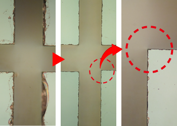 「次工程(お客様側の工程)で発生するカケを改善してほしい」とのご依頼を受けて、従来切断加工していたガラス製品に、切断と面取りの同時加工を提案。それによりお客様アセンブリ工程の歩留まりが向上しました。